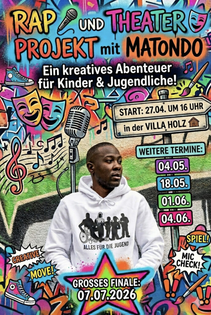 Mit harten Beats und gereimten Versen startet am 27. April, ab 16 Uhr, der Theaterworkshop im Rahmen des über das Programm “Sozialer Zusammenhalt” geförderteren QM-Projektes „TiK TiK – 2. Akt“ mit dem Rapper Matondo. Darauf freuen sich die Villa-Kinder schon seit Wochen und ebenso auf das Sommerkonzert mit dem Streetworker, Musiker und Schauspieler in der Villa. Die nächsten Workshoptermine sind am 4. und 18. Mai und am 1. und 4. Juni, das Sommerkonzert dann am 7. Juli 2026 in der „Villa Holz“.