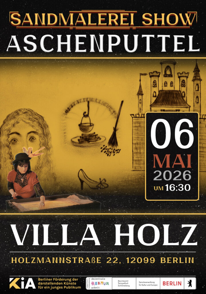 Am 6. Mai 2026 wird es ab 16.30 Uhr in der „Villa Holz“, Holzmannstraße 22, wieder mystisch – bei der Sandmalerei Show „Aschenputtel“. Zu malerischen Klängen wird das bekannte Märchen mit kunstvoll verteilten Sand erzählt.