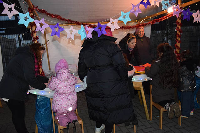 Die Kita „Paradiesvögel“ hatte am 12. Dezember 2025 Kinder und ihre Eltern zum Weihnachtsfest eingeladen und viele kamen in den Garten der Kita. Stände waren aufgebaut, an denen gemalt und gebastelt werden konnte, was die Kinder gerne angenommen haben. Einen Weihnachtsstern auszuschneiden war nicht schwer, ein Häuschen aus Keksen zusammenzubauen dagegen schon. Aber auch das haben die Kids mit Bravour gemeistert und ihre kleinen Kunstwerke stolz nach Hause getragen. Auf der Spielfläche war ein Bewegungsparcours aufgebaut, auf dem sich die Kinder ausprobieren konnten. Natürlich war auch reichlich für das leibliche Wohle gesorgt, es gab Süßes und Herzhaftes, aber der Renner mit der längsten Schlange waren frische Waffeln.