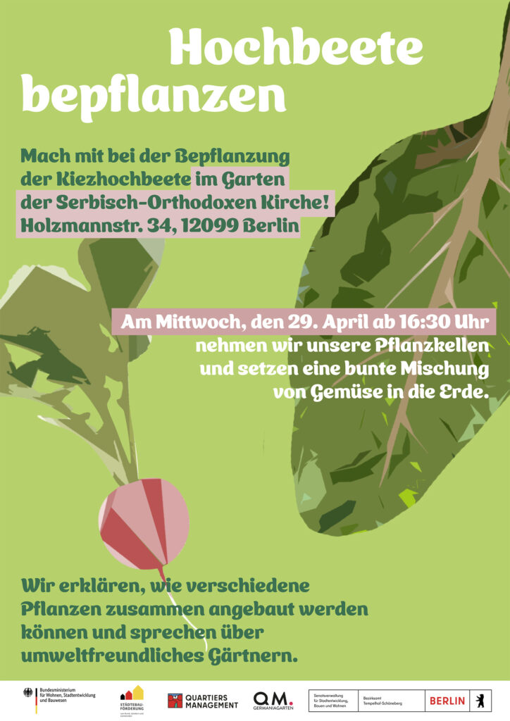 Die Hochbeete im Garten der Serbisch-Orthodoxen Kirche, Holzmannstraße 34, wurden im Rahmen des Projektes „Quartiersküche Germaniagarten – gemeinsam schmeckt’s am besten!“ angelegt und gepflegt. Nun ist das Projekt beendet, aber natürlich sollen die Hochbeete weiter genutzt werden. Um dann im Herbst etwas zu ernten, ist für den 29. April 2026, ab 16.30 Uhr eine gemeinsame Pflanzaktion geplant. Dafür wurden Mittel aus dem Aktionsfonds zur Verfügung gestellt.