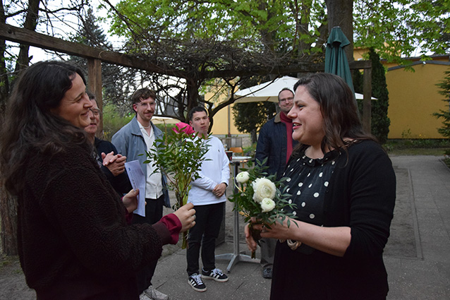 Bezirksstadträtin Eva Majewski-Sparacino dankt Quartersmanager*innen Kim Stolfik, Varvara Kontsevich und Manuel Kuhn für die geleistete Arbeit.