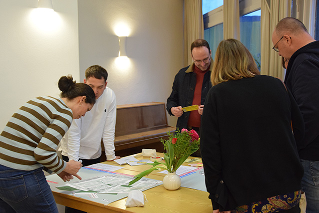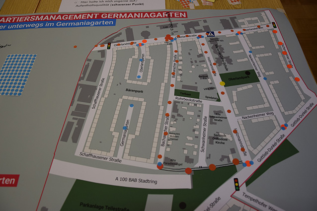 Eine erste Meinungsumfrage hatten sie zum Forum mitgebracht: Wo bewegen Sie sich am häufigsten, welche täglichen Wege legen Sie zurück? Wo sehen Sie Gefahrenstellen, wo Hindernisse? Und wo halten Sie sich ungern auf? Das konnten die Teilnehmenden auf zwei Gebietskarten eintragen und so schon ein erstes Stimmungsbild an die Projektverantwortlichen weitergeben.