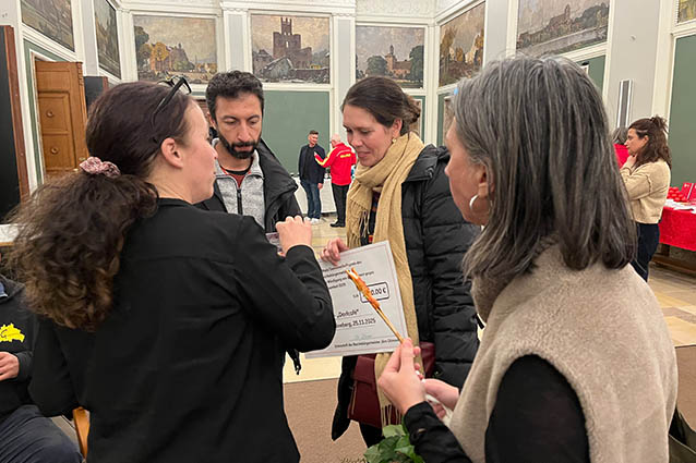 Nun wurde es spannend. Die Preisverleihung begann mit den drei dritten Preisen. Zu ihnen gehörte „Inklusiver Spaziergang und gesundes Essen“, „Eine Prise Menschlichkeit“ und „L-Support“. In den Laudationen dazu stellten die Mitglieder der Jury die Projekte vor und dankten ihnen für ihren Einsatz mit einer Anerkennungsurkunde. Dann kamen die ersten beiden Plätze, die mit 500 und 1000 Euro dotiert waren. Am Tisch stieg merklich die Anspannung. Der zweite Platz ging an den „Kiezladen Miteinander“. Etwas ungläubig schauten sich alle an – wir sind auf dem ersten Platz!