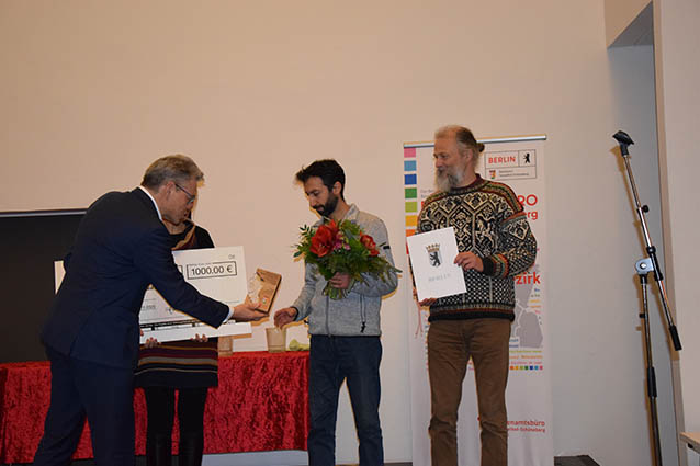 Der Bezirksbürgermeister überreicht Halil den Preis, Anna hat den Scheck und Stefan die Urkunde.