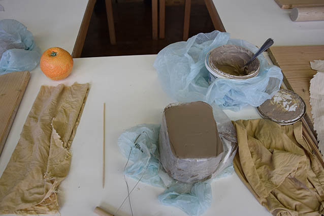 Dazu sind zahlreiche Arbeitsschritte erforderlich. Alina erklärt das: „Erstmal eine Platte ausrollen, die in zwei Hälften schneiden, die schöne Seite nach außen. Dann kommt die Platte in die Form und dann föhnen, bis es rausgeht. Zusammenkleben und mit dem Schwamm einmal rüber und die Löcher glattstreichen.“ Naigel hat – wie die anderen – schon eine gewisse Perfektion entwickelt. Er arbeitet gerade an einem Apfel und drückt Kerben in den Rand der Tonhälfte. „Das hält besser. Die zwei Hälften werden zusammengeklebt, mit Schlicker.“ Was ist denn das? „Na, Ton mit Wasser gemischt.“ Naigel fügt die beiden Hälfen zusammen und wischt mit dem Schwamm drüber. Auf der anderen Seite des Tisches werden die „Apfelrohlinge“ mit Stielen und Blättern verziert. Lea schneidet mit etwas Hilfe ein Blatt zurecht. Sieht gut aus. Nun noch die Adern einzeichnen. Da zögert sie: „Das kann ich nicht“. Wieder bekommt sie Hilfe und siehe da, es klappt.