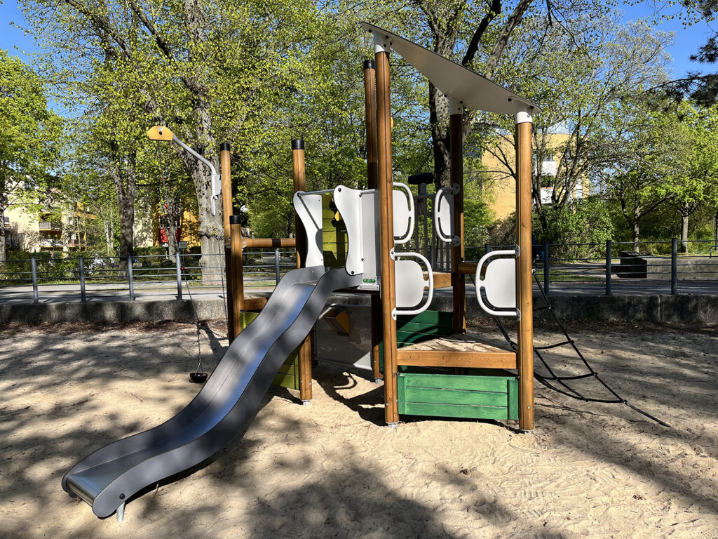 Über ein Kletternetz gelangen die Kinder auf verschiedene Podeste. Von dort aus können sie über eine Rutsche wieder hinuntersausen. Zusätzliche Spielelemente wie kleine Guckfenster, eine Spieltafel sowie bewegliche Schalen zum Befüllen mit Sand regen die Fantasie an und machen den Turm zu einem kleinen Abenteuerschiff. Durch die verschiedenen Ebenen und Zugänge eignet sich der neue Spielturm besonders gut für gemeinsames Spielen und erste kleine Rollenspiele. Die Finanzierung des neuen Spielgeräts erfolgte aus Mitteln der Parkraumbewirtschaftung.