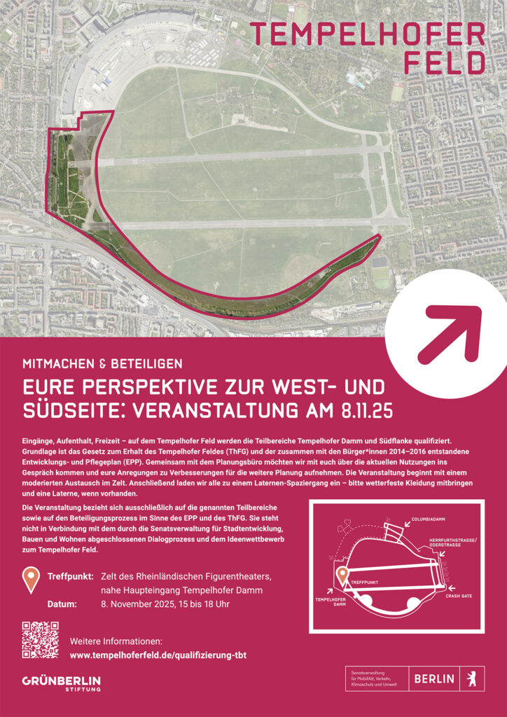 Auf dem Tempelhofer Feld werden die West- und Südseite umgestaltet. Anregungen für die Freiraumplanung können auf einer Veranstaltung vor Ort am 8. November 2025 von 15 bis 18 Uhr, im Zelt des Rheinländischen Figurentheaters, nahe Haupteingang Tempelhofer Damm, eingebracht werden. Grundlage ist das Gesetz zum Erhalt des Tempelhofer Feldes und der zusammen mit den Bürger*innen 2014-2016 entstandene Entwicklungs- und Pflegeplan. Für das Land Berlin, vertreten durch die Senatsverwaltung für Mobilität, Verkehr, Klimaschutz und Umwelt, übernimmt die Grün Berlin Stiftung die Planung.