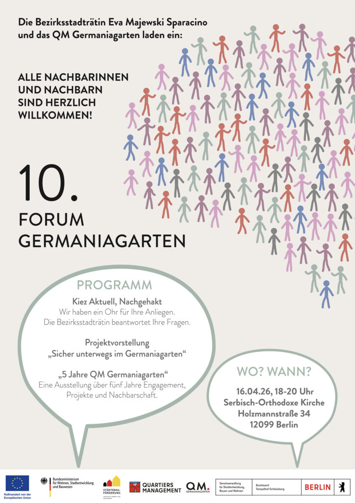 Eva Majewski Sparacino, die Bezirksstadträtin für Stadtentwicklung und Facility Management, und das QM-Team Germaniagarten laden alle Anwohnenden ganz herzlich zum 10. Forum Germaniagarten am 16. April 2026 ein. Von 18 bis 20 Uhr findet die Veranstaltung in der Serbisch-Orthodoxe Kirche, Holzmannstraße 34, statt. Im Rahmen einer Ausstellung blicken wir zurück auf 5 Jahre Quartiersmanagement Germaniagarten. Zudem wird das neue Projekt „Sicher unterwegs im Germaniagarten“ vorgestellt, das gerade gestartet ist. Wie immer wird die Stadträtin bei „Kiez Aktuell“ ein Ohr für die Anliegen aus der Nachbarschaft haben und Fragen der Teilnehmenden beantworten.
