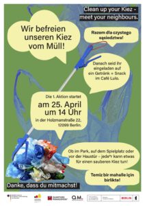 Am 25.04. startet die Aktion “Müllfrei”. Gemeinsam wollen wir unseren Kiez vom Müll befreien und dauerhaft sauber halten. Dafür hat eine Nachbarin die Aktion “Müllfrei” ins Leben gerufen. Alle zwei Wochen trifft man sich als nachbarschaftliche Gruppe und räumt mit Müllzangen, Pickern, mobilen Mülleimern und weiterem Gerät die Parks, Gärten und Gehwege auf. Als kleines Dankeschön und Wertschätzung für das gemeinsame Saubermachen wird im Anschluss an jede Aktion ins Café Lulo in der Eschersheimer Straße eingeladen. Hier gibt es für alle engagierten Helfer*innen ein Getränk und ein Stück Kuchen oder ein anderer Snack der Wahl kostenlos. Bei Kaffee und Kuchen kann man sich weiter kennenlernen, die nächsten Termine planen und vielleicht überlegen, ob es noch weitere Ideen für den Kiez gibt, die man gemeinschaftlich umsetzen kann.