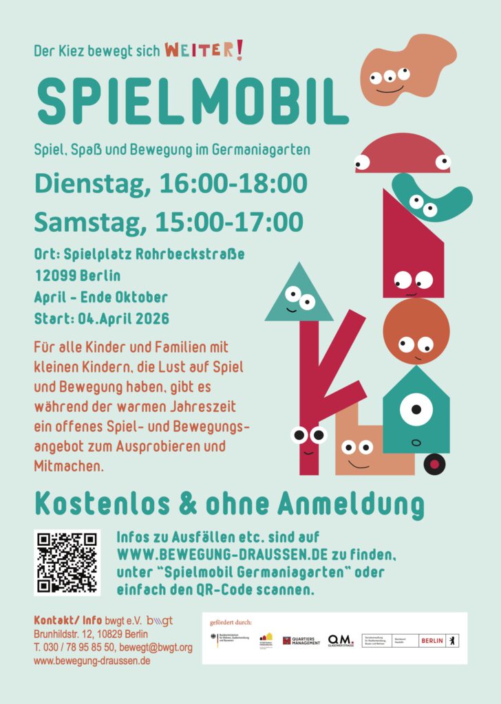 Das Projekt “Der Kiez bewegt sich weiter!” des Trägers bwgt e.V. lädt in der warmen Jahreszeit jeden Dienstag in der Zeit von 16.00 Uhr bis 18.00 Uhr und jeden Freitag von 15.00 Uhr bis 17.00 Uhr zum Spielmobil auf dem Spielplatz in der Rohrbeckstraße ein. Spiel, Spaß und Bewegung für Kinder und Familien mit kleinen Kindern (Alter 1 – 5 Jahre) durch ein buntes Programm zum Ausprobieren und Mitmachen. Wie alle QM-Angebote natürlich kostenlos und ohne Anmeldung!